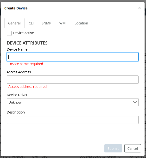 3. On the General tab, select Device Active, enter the Device Name, Access Address (only the hostname is allowed, not the IP address; you can append <domain-name> to it, but that is not required), select the Device Driver from the list (or leave it unknown if you do not see an appropriate driver in the list). You do not have to enter a Description, as the LDAP server automatically populates that field with Imported from LDAP Server.