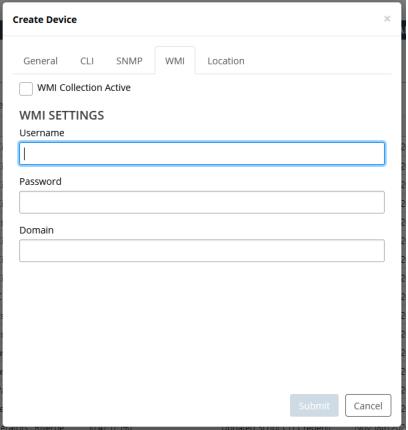4. Select the WMI tab, select WMI Collective Active, and enter the appropriate credentials on the WMI-enabled device in the Username, Password, and Domain fields.