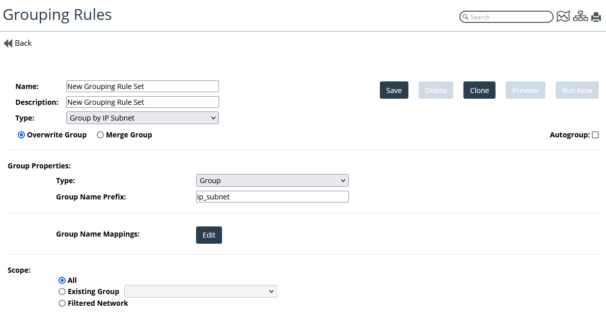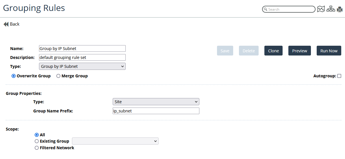 The Scope controls whether the grouping rule is applied to all devices in the NetIM database or only certain devices.