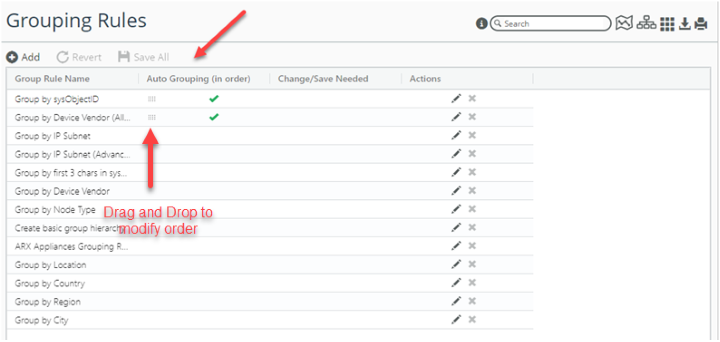 You can control the order in which grouping rules will be executed on the backend. Ordering can be important if one grouping rule depends on the results of another grouping rule. You can drag and drop the grouping rules to control the order and then save to preserve the order.