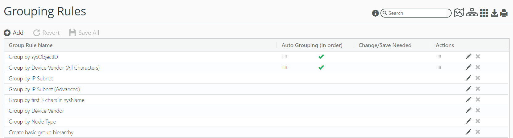 A grouping rule is a set of user-defined criteria for grouping devices. You will first configure one or more grouping rules and preview the results for each. When you are satisfied with the results preview, you can create groups based on the grouping rules by running the Grouping Rules page. The Grouping Rules page creates groups based on the current state of the devices in NetIM.