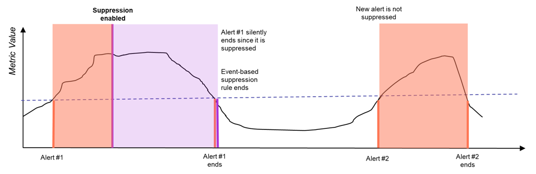 When event-based suppression rules are applied, the rule only applies to a specific alert – i.e., alerts matching <First Seen Timestamp, Profile, Object, Metric Class, Metric Field>. When a similar violation occurs, a new alert will be generated and will not be suppressed automatically. In the example below, the suppression rule is automatically removed when Alert #1 returns to normal. Thus, when the metric value later exceeds the threshold for the same object, a new active alert is generated, and any associated notification messages will be sent.