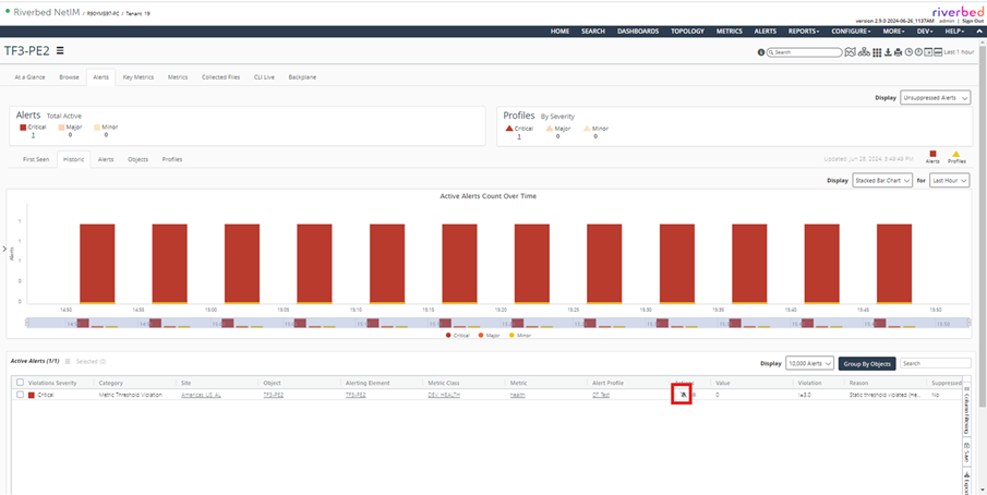 To remove suppression, click the bell icon and it will delete the alert suppression rule and will also disable suppression on that alert. This opens a dialog box to confirm your intentions. Click OK and it will remove the alert suppression rule if that was the only element associated with that rule. In addition to removing the alert suppression rule, it will disable suppression; that is, it will enable notification of those alerts if they happen again in the future. The next time the alert happens, you will see the alert appear in the alerts manager. (This depends, based on the poll frequency and the time when the violation really occurs based on the metric value crossing any bounds).