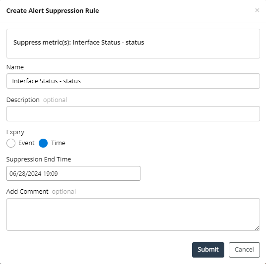 In addition to specifying the end time of the alert suppression, you can add additional comments. After you are satisfied with the changes, click Submit.