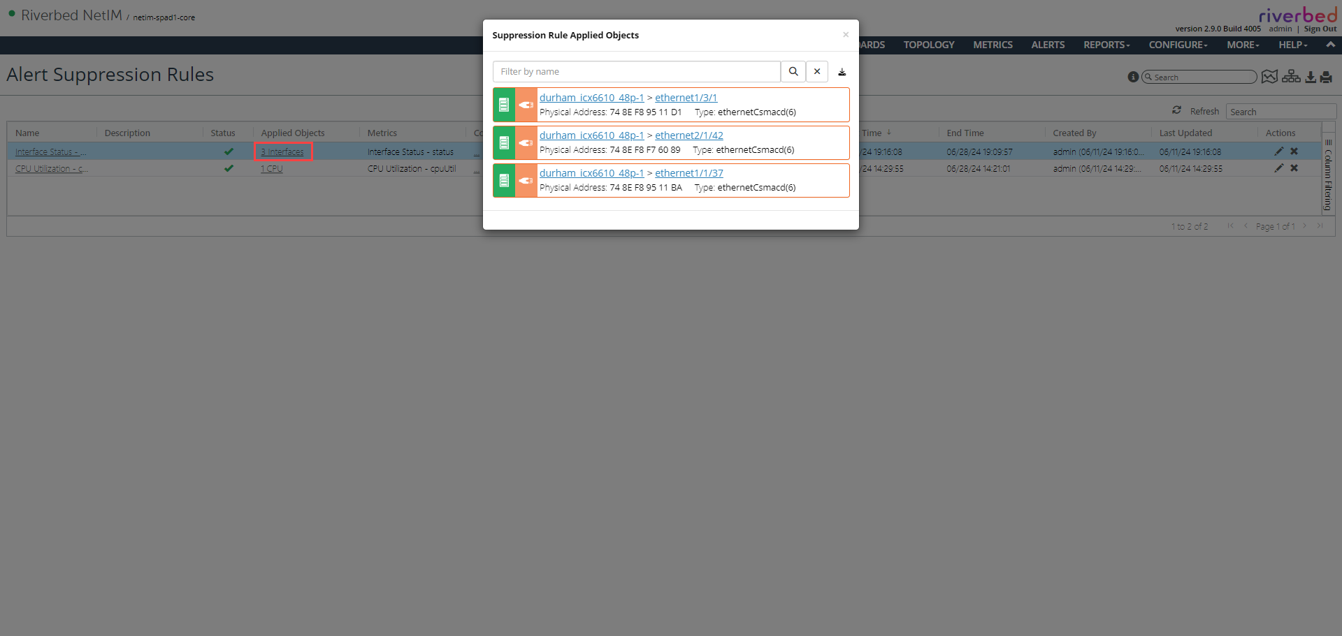 You can go back to the Alert suppression rules page to view this newly created rule. In that page, if you want to quickly look at all the interfaces on which this alert suppression rule was created, you can simply click Applied Objects. Even though the screenshot below shows all the applied objects are on the same device, this is not necessary. The rule needs to be on the same metric class and metric field but not on the same elements.