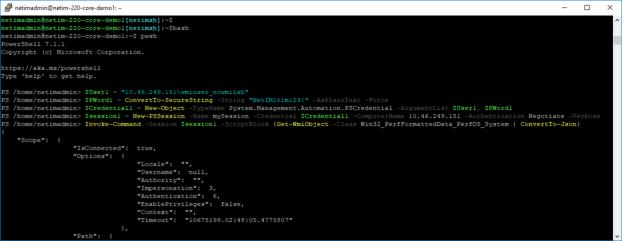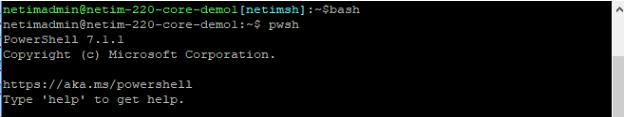 Log in to the NetIM core or a NetIM worker as netimadmin (the default password is also netimadmin) and invoke the PowerShell CLI by first entering the bash shell and then entering pwsh, as shown in the following screen: