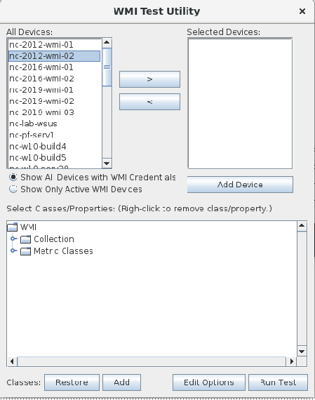 You can also use NetIM GUI-based WMITEST utility for troubleshooting. The WMITEST tool is akin to NetIM’s SNMP MIBBROWSER test tool but geared toward Windows system attributes and metrics.