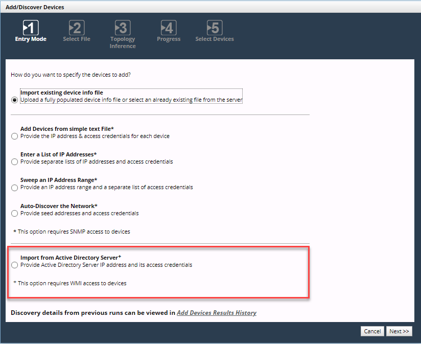 You can add Windows systems for collection and polling in many of the same ways you add devices for SNMP polling and collection and CLI (Command-Line Interface) collection. Add devices using the Configure > Add/Discover Devices wizard, as follows: