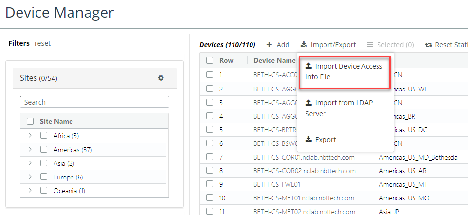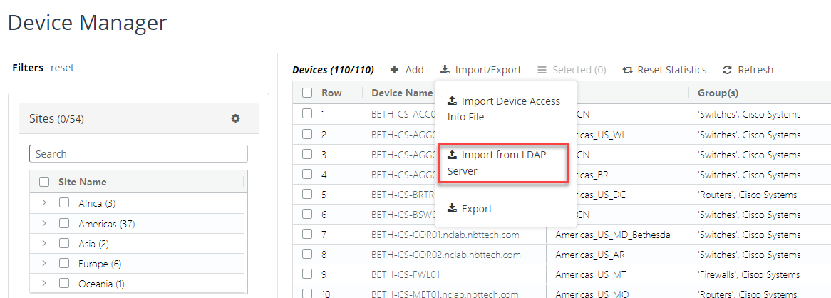 • Add devices using Device Manager’s Import from LDAP Server, as follows.