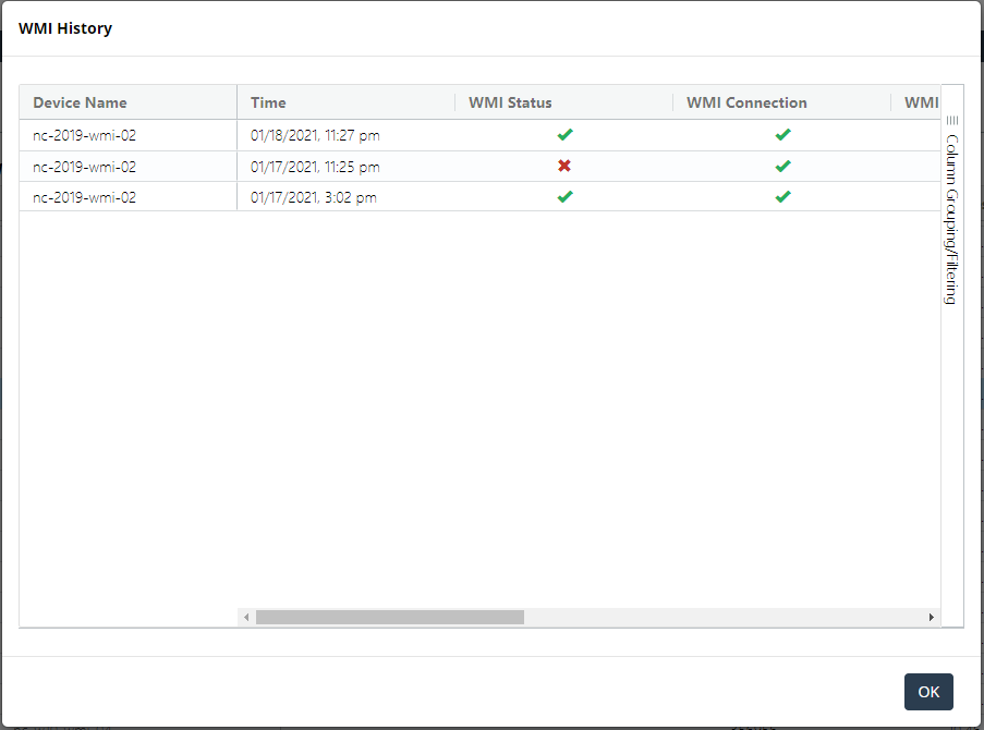The Device Manager provides detailed collection status for each device from the Statistics > View WMI History option, as follows.