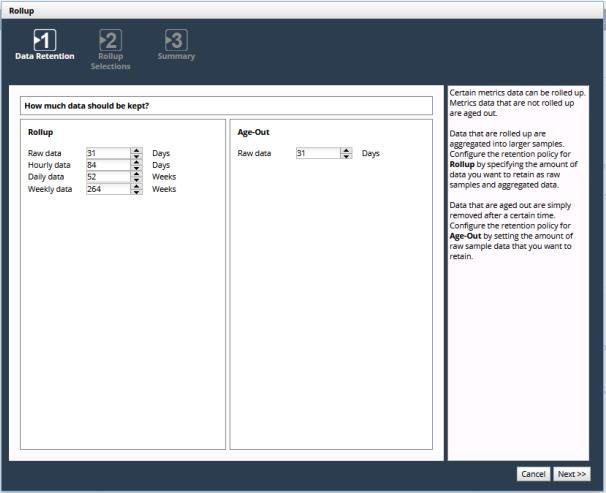 Use the Rollup wizard to configure data retention thresholds for age out and roll up, as well as the rollup operations that will be performed on metric classes that can be rolled up.