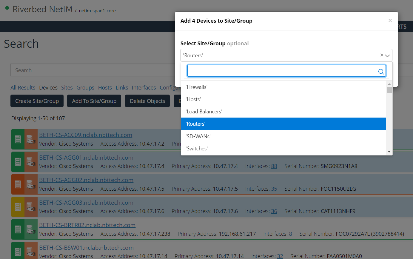 Once you have your search results, you can select items and add them to a site or group or create a new site or group from the selection. In the following example, you have selected several devices you want to add to a site or group. After selecting the items, you can click Add to Site/Group to launch the grouping dialog box.