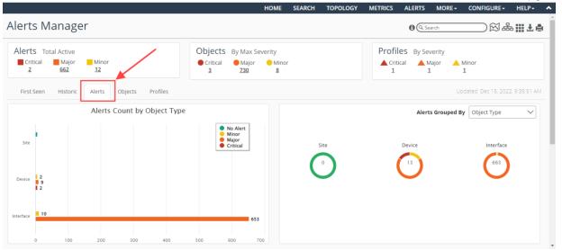 – Alerts Tab—Displays alert count by object type and alerts grouped by object type, metric class, and metric name.