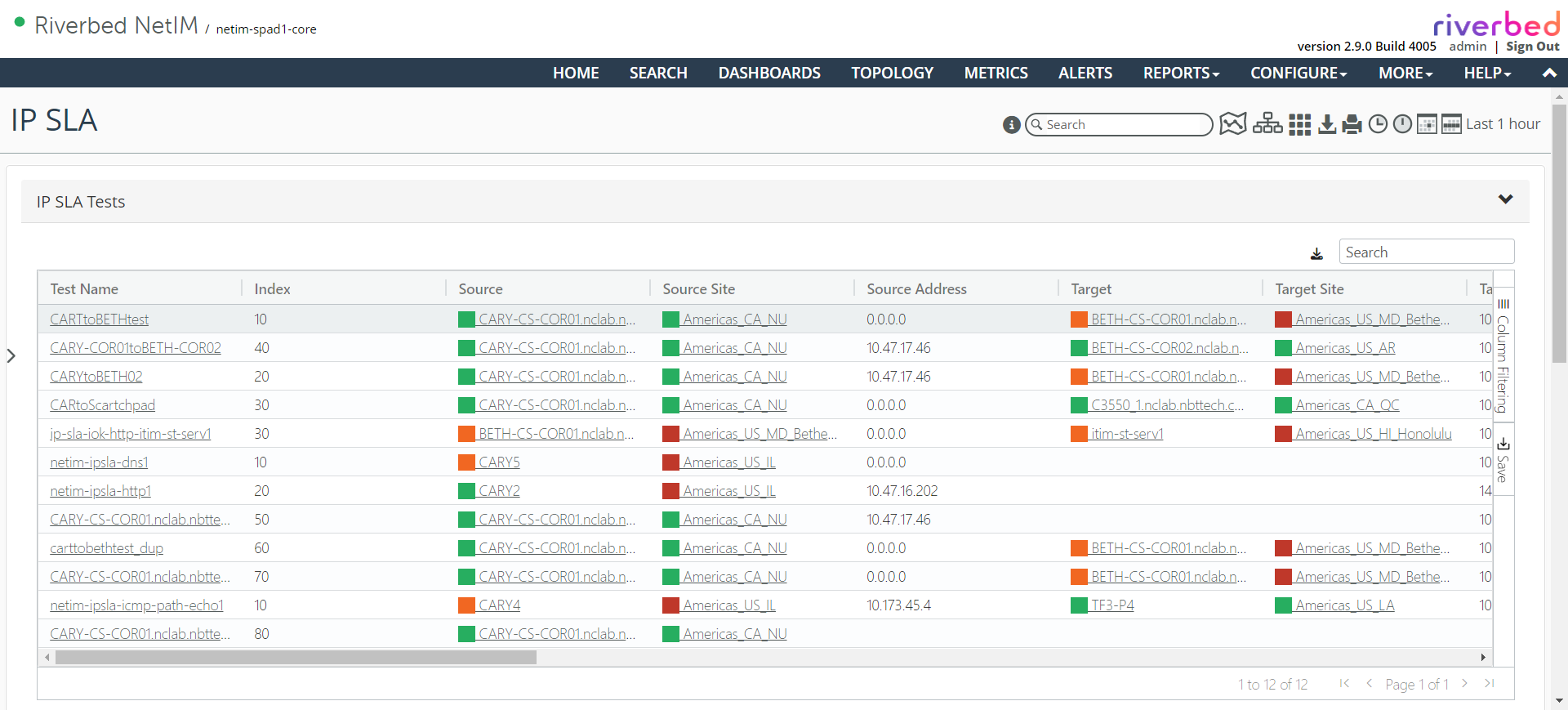 The IP SLA Details frame consists of several columns of salient IP SLA test information that give you the ability to search, sort, and filter the table of tests. You can also drill down to the specific test, source/target site, or source/target device of the test, as shown in the following screen.
