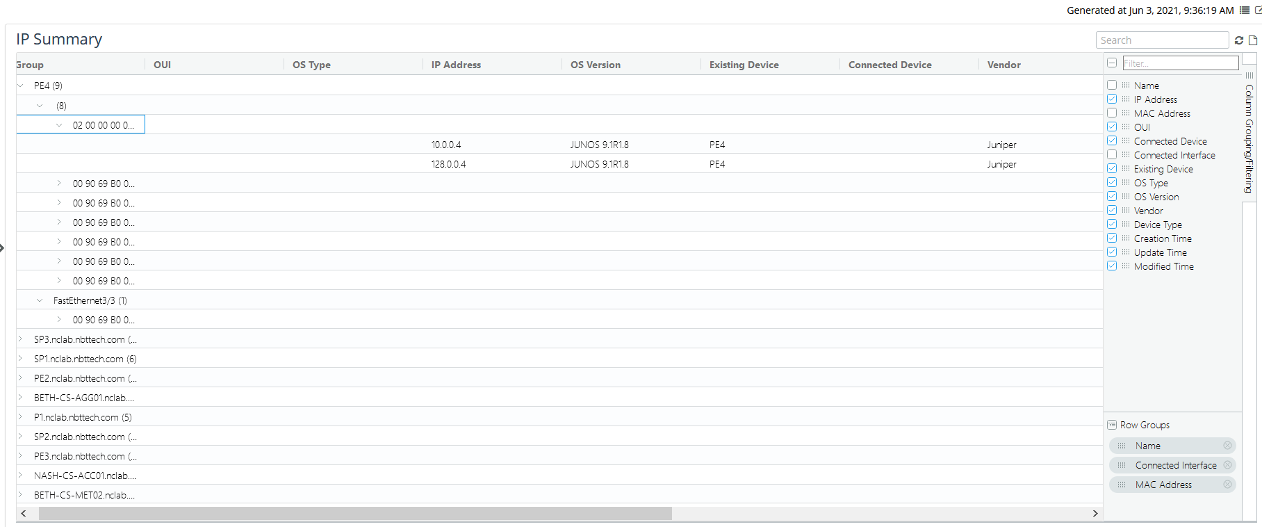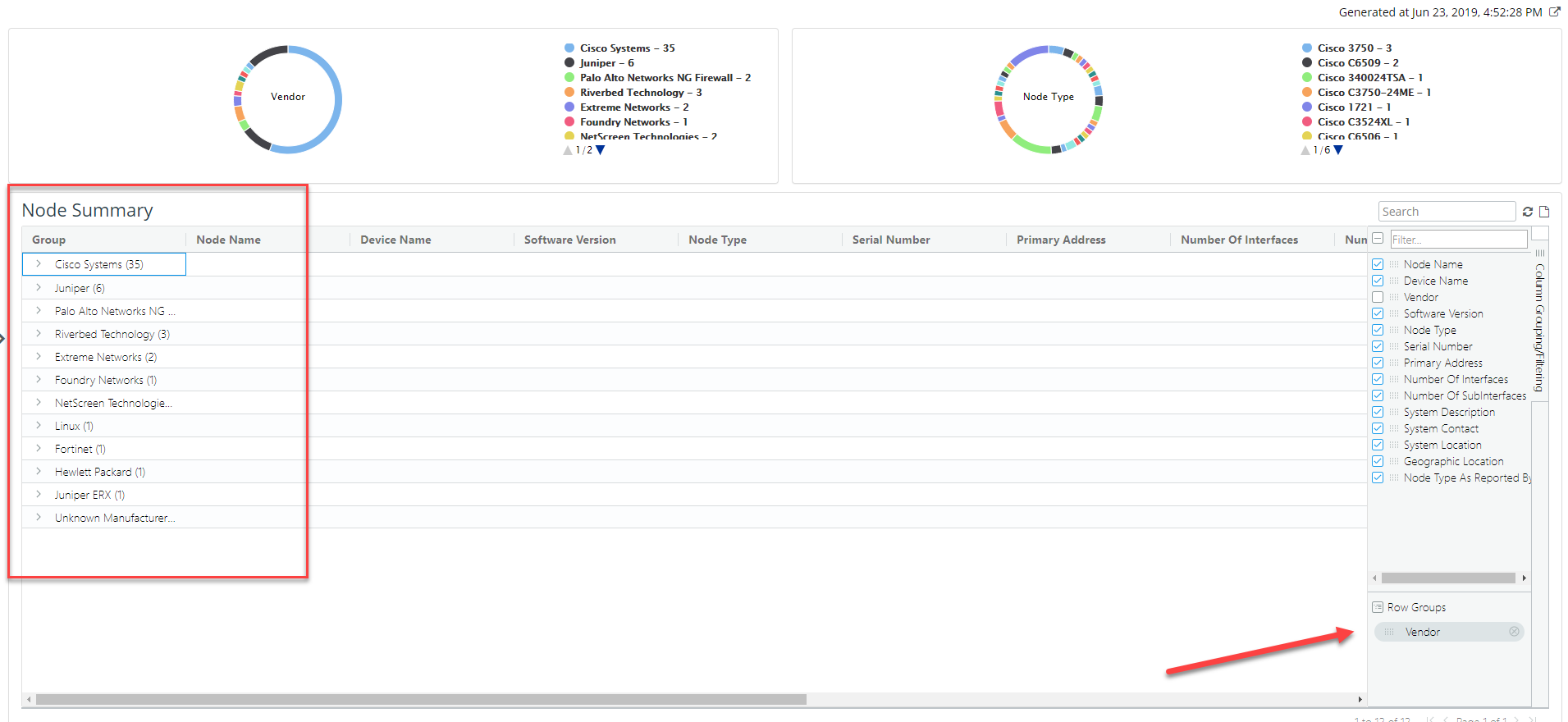 Column grouping allows you to group or aggregate the content based on specific selected columns. In the following example, the report is grouped by the vendor column which then provides a summary count of each vendor and allows you to expand the contents using a tree-like paradigm.