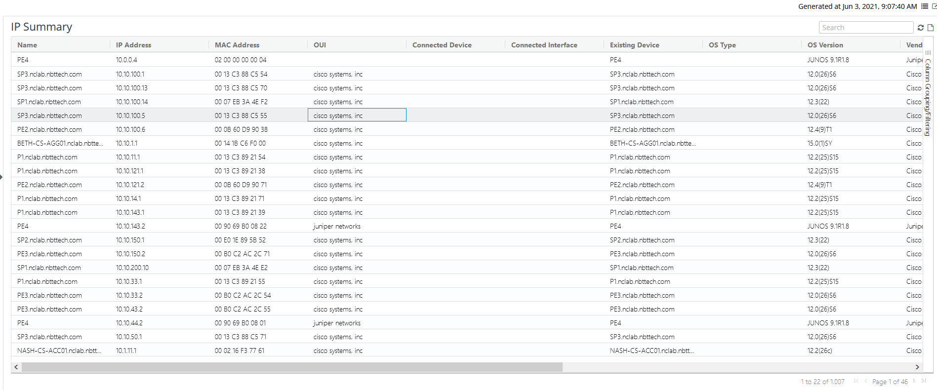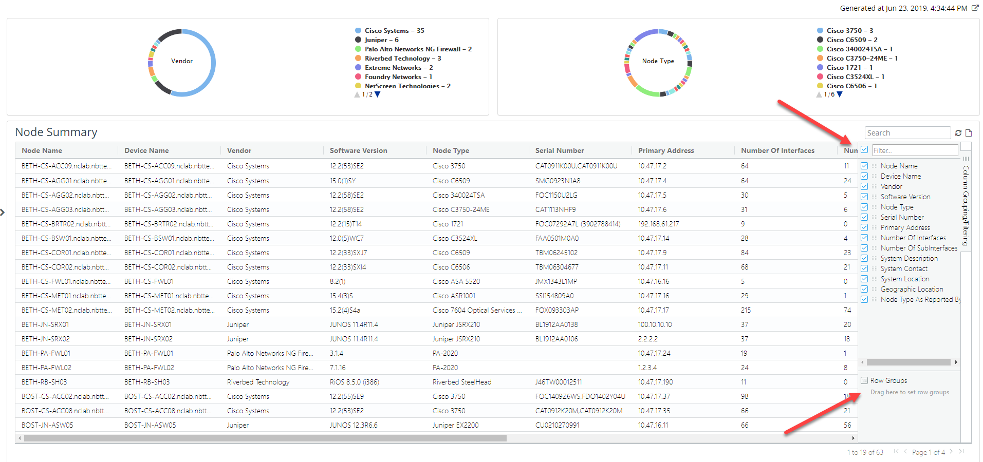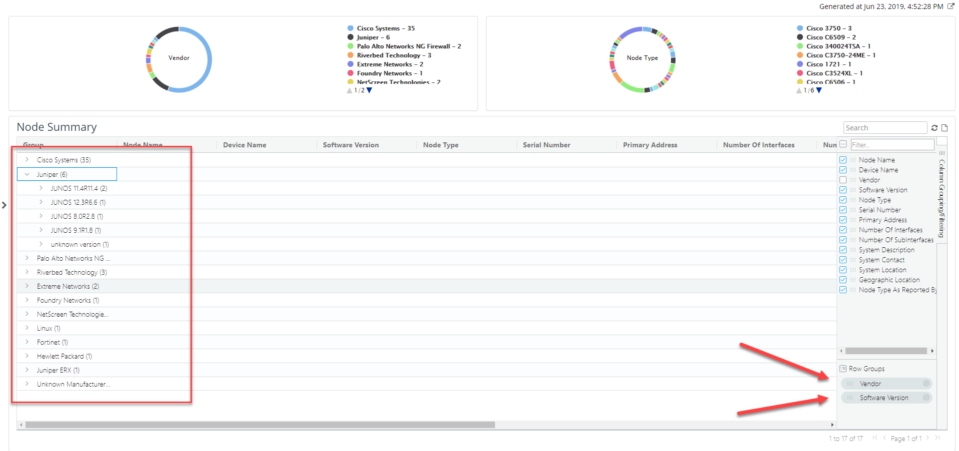 In the following example, vendor and software version are used for grouping so you can sort and view the data first by vendor and then by software version.