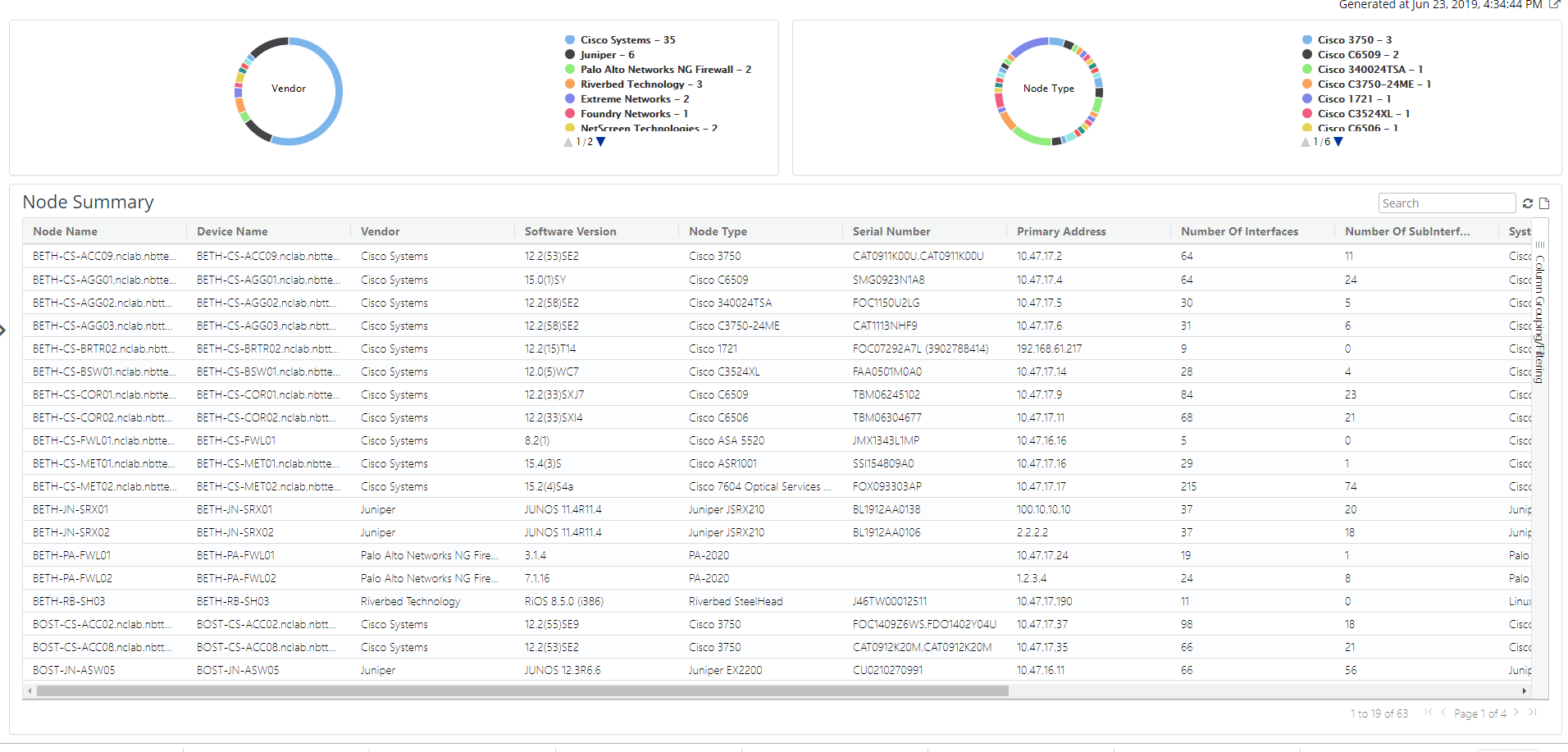 Many inventory and configuration reports support pie charts that summarize the tabular data by a particular column like vendor and node type, as shown in the following screen.