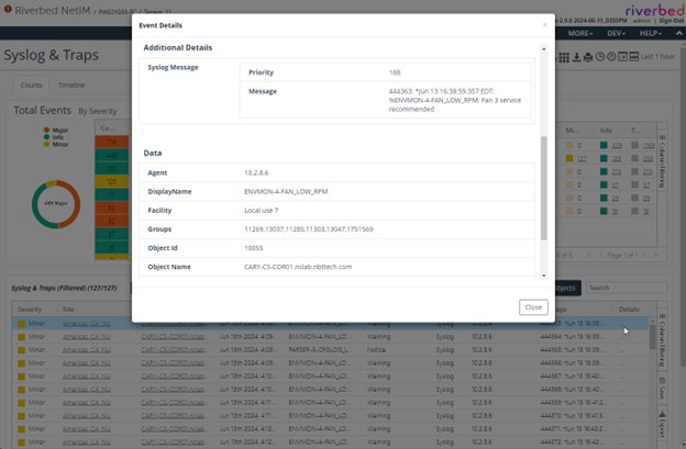 You can click any device name in the global events counts and details table to go to the device-specific Syslog & Traps view. This view contains all the information about the events only for that device.