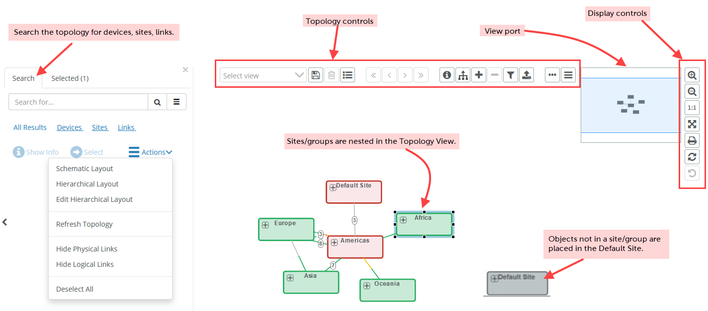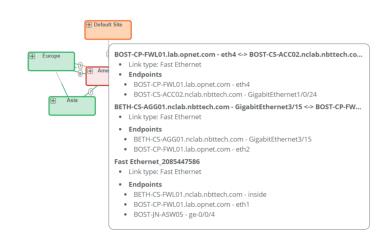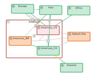 You can also drill down on the topology, by clicking a site, as shown in the following screen in which America has been expanded.