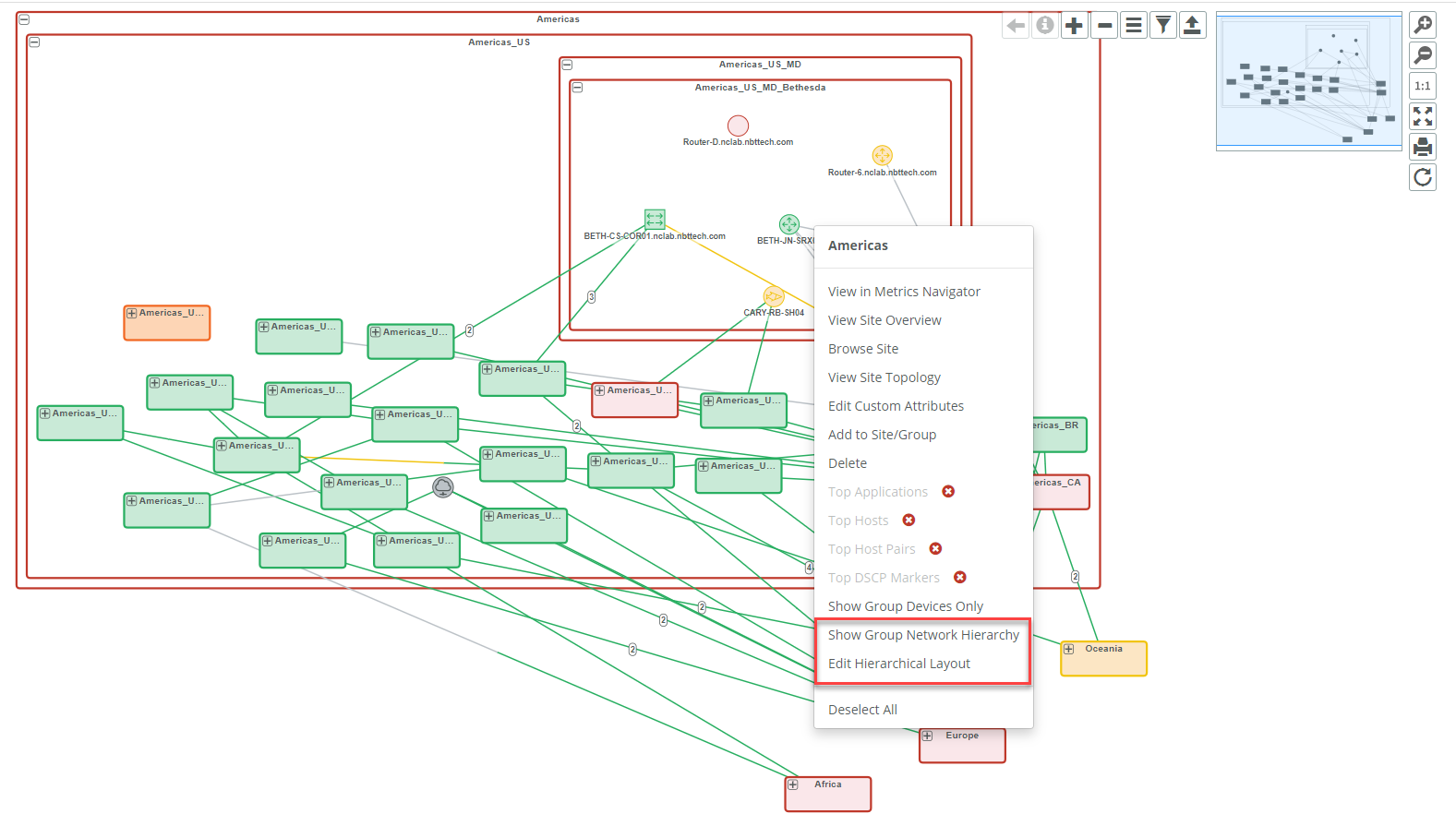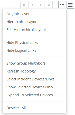 You can display sites and groups in a hierarchical layout. From a Site or Group Topology tab’s ellipsis icon (three dots), you can perform a variety of tasks and display the topology by a variety of layouts, including Organic and Hierarchical, as shown in the following screen.