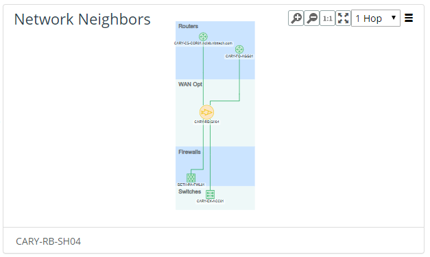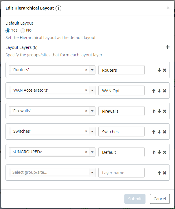 The layers and default you set here also apply to a device’s Network Neighbors panel. The following example is a hierarchical layout applied to a site topology with layers assigned as indicated in the screen.